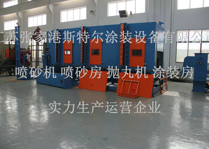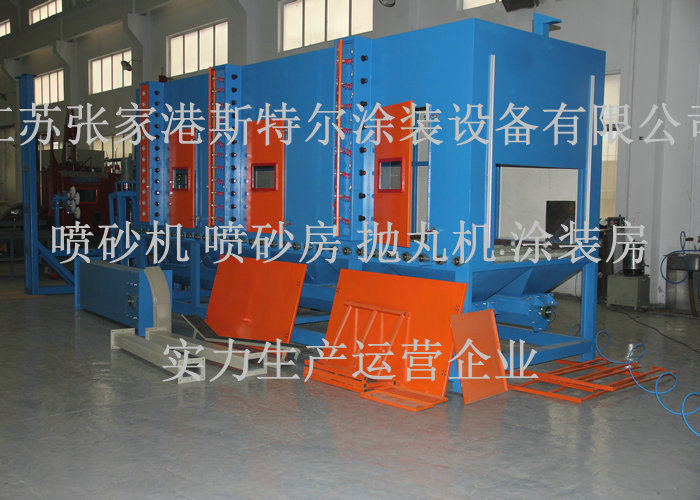 方形坩堝產品內壁處理要求而專門設計的專用型輸送式自動噴砂機,適合需求公司所提供的產品。根據需求公司對產品效率的要求,本機設置一套自動輸送線,共分五段線體。噴砂艙內共設三個噴砂位,工件通過輸送線體帶動步進方式分別在三個噴砂位進行噴砂加工清理,噴砂區域內共布置20支普壓高速噴砂咀,在噴砂區第一個噴砂位布置8支噴咀噴工件內底面,在噴砂區第二個噴砂位布置6支噴咀噴工件內前后側面,在噴砂區第三個噴砂位布置6支噴咀噴工件內左右側面,噴咀可根據加工需要,適當調整其噴射角度,其自動化程度較高。每個工件需間歇進行三次噴砂清理加工,才能完成整個內表面的清理。在出口處設有翻轉機構,用于傾倒內部的砂料,該動作自動完成,無需人工操作。 噴砂加工制作工藝 步驟流程